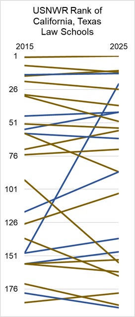 In 2015, there were four California schools in the “top 25” of the USNWR rankings and just one from Texas.