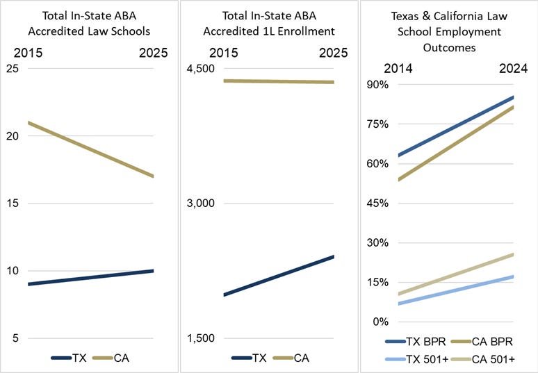 Despite the closure of four ABA schools, total 1L enrollment remains mostly flat in California. It was 4363 1Ls enrolled a decade ago compared to 4347 today. But in Texas, 1L enrollment has grown significantly, from 1982 a decade ago to 2407 today.