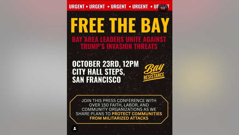The flyer bills the event as “Bay Area leaders (uniting) against Trump’s invasion threats,” and states there will be “over 150 faith, labor and community organizations” that will share plans to protect communities from militarized attacks.
