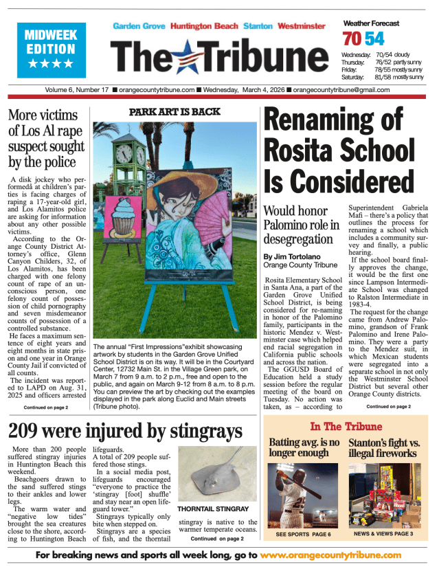 The latest e-newspaper of The Orange County Tribune is out. The Tribune serves Garden Grove, Huntington Beach, Stanton and Westminster in Orange County, California. We are a non-partisan news organization which covers local and national news, arts and living and sports. Published Wednesdays and Saturdays. For a free subscription, send us a request to orangecountytribune@gmail.com .