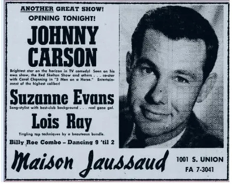 Was Carson being fair? An ad in The Bakersfield Californian had promoted his appearance at Maison Jaussaud – now the Golden West Casino – as featuring ‘one of the bright young men of show business.’ A review of that very first show, also published in The Californian, described the effort as ‘a solid hit with patrons’ and Carson himself as ‘one of the very best of the post-war comedians.’