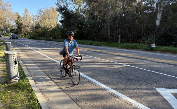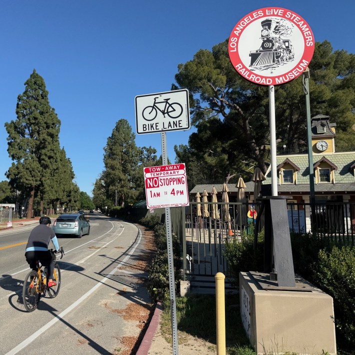 City Transportation Department (LADOT) crews are currently installing about four miles of new striping on the main surface road through the city’s biggest park: Crystal Springs Drive/Western Heritage Way/Zoo Drive. The project reduces car travel lanes in some areas; part of Crystal Springs is going from four travel lanes to two. Much of the project is adding plastic-post-protection to existing bike lanes, though long stretches remain unprotected.