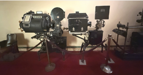 Vintage projection equipment on display in the lobby of The Grand Lake Theatre