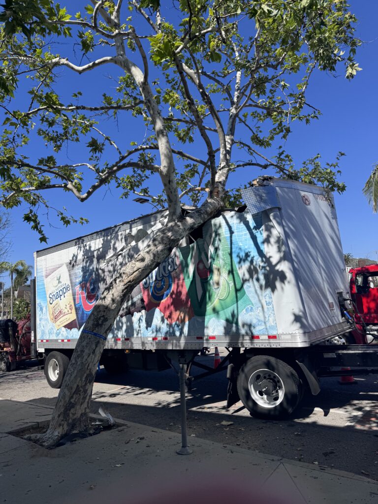A delivery truck was stranded and instead of having it go up the middle of LaCruz to escape the gas/water mess, a city worker waved the driver into the lane next to the curb (where cars are usually parked), where it became entangled in Sycamore branches.