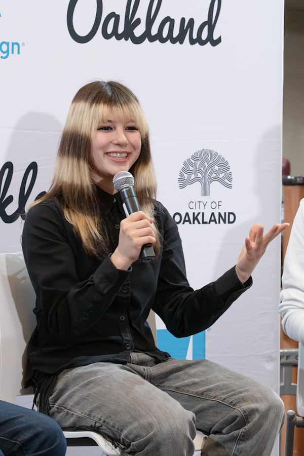 Gold-winning ice-skater Alysa Liu speaks with reporters at Oakland City Hall on March 12, 2026. Jerome Parmer/STAFF,