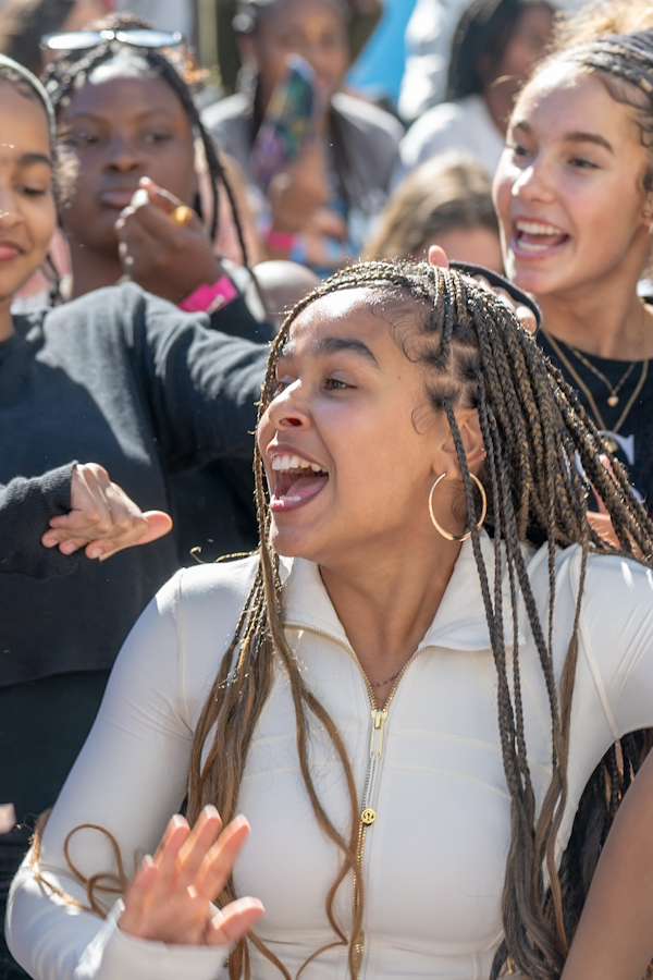 Young fans dance as Kehlani performs during a rally for gold-winning ice-skater Alysa Liu at Oakland City Hall on March 12, 2026.