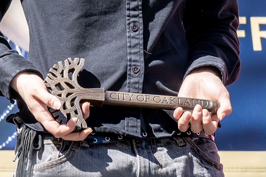 Gold-winning ice-skater Alysa Liu accepts Oakland’s Key to the City from Mayor Barbara Lee and Kehlani at city hall on March 12, 2026.