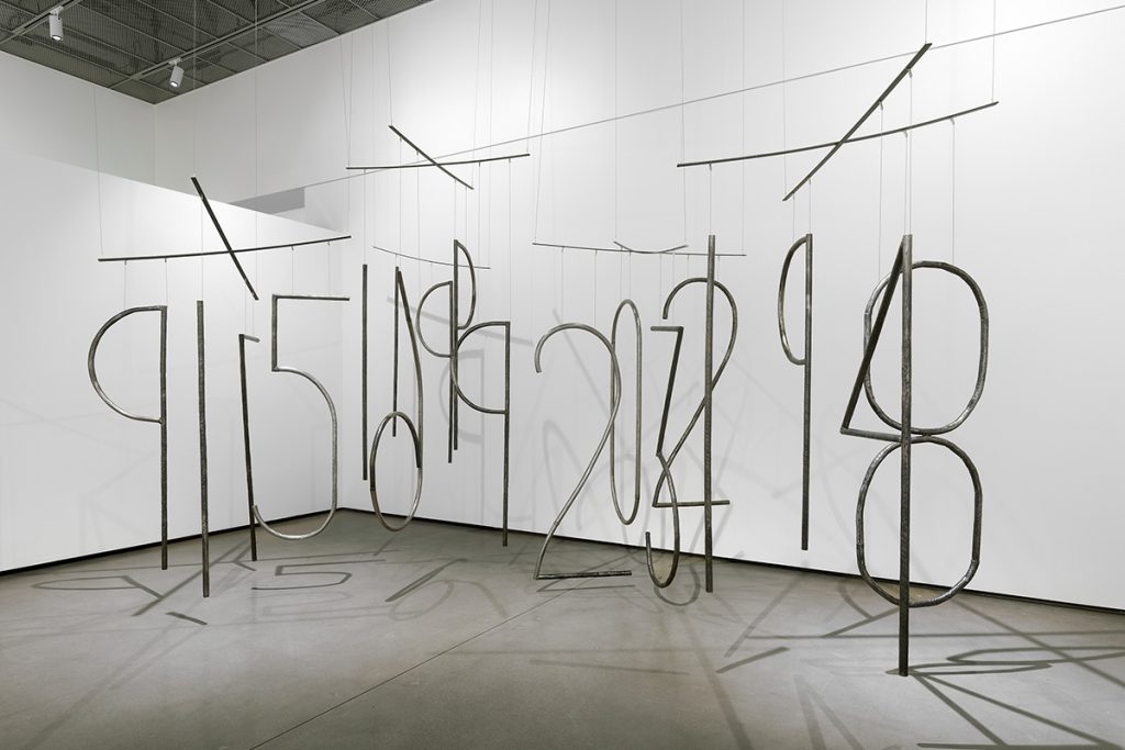 Kantor explained that at the Wexner, “They were more static. We really liked the idea of hanging it from the ceiling to give a sense of movement.” As the numbers almost imperceptibly drift or turn on their wires, the lighting also ignites a shadow play. The dates, Kantor said, are of importance to the Eastern Mediterranean, the Middle East and West Asia. “They give that sense of movement and perspective about the way in which humans think about time,” she said.