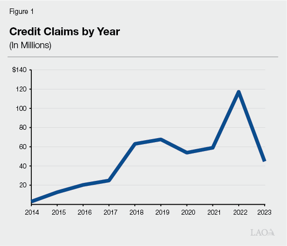 Fiscal Effect of Program Is Variable. Figure 1 shows the value of credits claimed each year since the program’s inception in 2014. Because applicants must provide sufficient evidence that the credit will influence their employment and investment decisions in the state, GO-Biz often does not award all tax credits available to be allocated in a given fiscal year. Therefore, although the program’s baseline annual allocation is $180 million, the fiscal effect of the program is liable to ebb and flow over time even if the size of the program does not. Additionally, limits on the use of tax credits by businesses will contribute to further fluctuations in the fiscal effect of the program in the current decade.