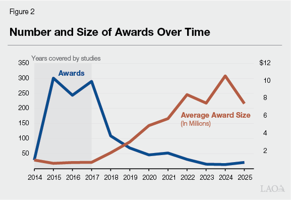 Award Characteristics Have Changed Over Time. While the characteristics of awards made by GO-Biz vary significantly within any given year, there has been a noticeable shift in the number and average size of awards over time: Figure 2 shows the number of awards made and the average credit amount per agreement for each year of the program. In earlier years, individual awards were much smaller and more numerous, whereas recent rounds have a much smaller number of awards that are typically worth several million dollars each. Changes made to the program in 2018 likely explain much of this trend. Specifically, the 2018 budget package: