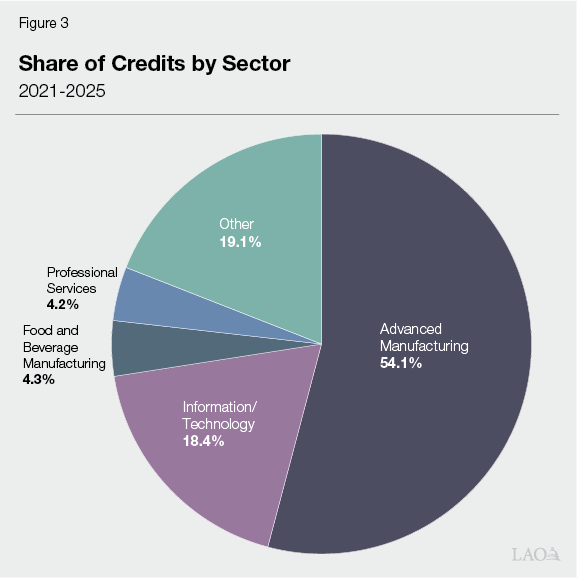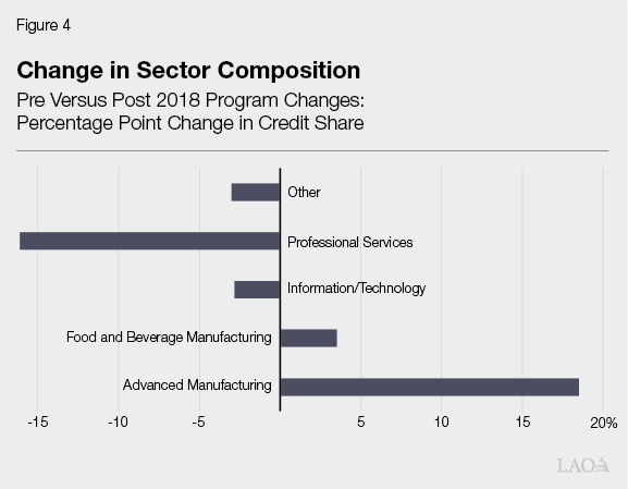 Industry Composition Reflects Intent of Program. Figure 3 shows how credits have been allocated across sectors over the last five years. Of the $1.2 billion in awards made between 2021 and 2025, around $650 million, or over half, has been allocated to businesses in advanced manufacturing. This category covers subsectors such as electronics and semiconductors, aerospace, battery technology, and biotechnology. The prominence of advanced manufacturers among credit recipients is consistent with the intent of the program, since (1) these types of facilities can locate in many parts of the United States, making tax incentives a potential deciding factor, and (2) they tend to provide relatively well-paid jobs, which increases the competitiveness of their applications. Figure 4 shows how credit allocation across sectors has changed since changes were made to the program in 2018. In particular, the share of awards going to advanced manufacturing firms has greatly increased while the share going to professional services (for example, accounting, legal, and local business services) has significantly decreased. This is especially consistent with the 2018 changes, since professional service firms tend to be classed as “non-tradeable,” meaning they are often already required to locate near their customer base, and thus tax incentives are unlikely to influence their decision to locate in California.