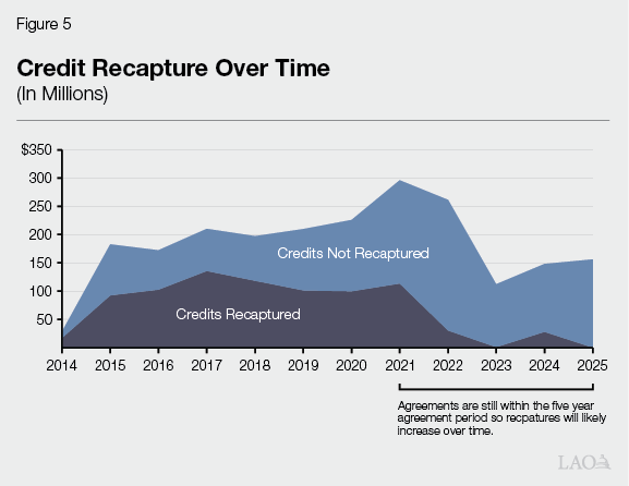 Roughly Half of Credits Are Recaptured Historically. Figure 5 shows both the total value of awards made and the amount recaptured for each year of the program. For awards made between 2014 and 2020, the recapture rate is almost 55 percent. This indicates that around half of the net job increases and investments promised in negotiated agreements ultimately never come to fruition or are not maintained long term. Agreements that are less than five years old have not reached the end of their initial agreement period and thus have lower recapture rates (shown in the shaded grey area).