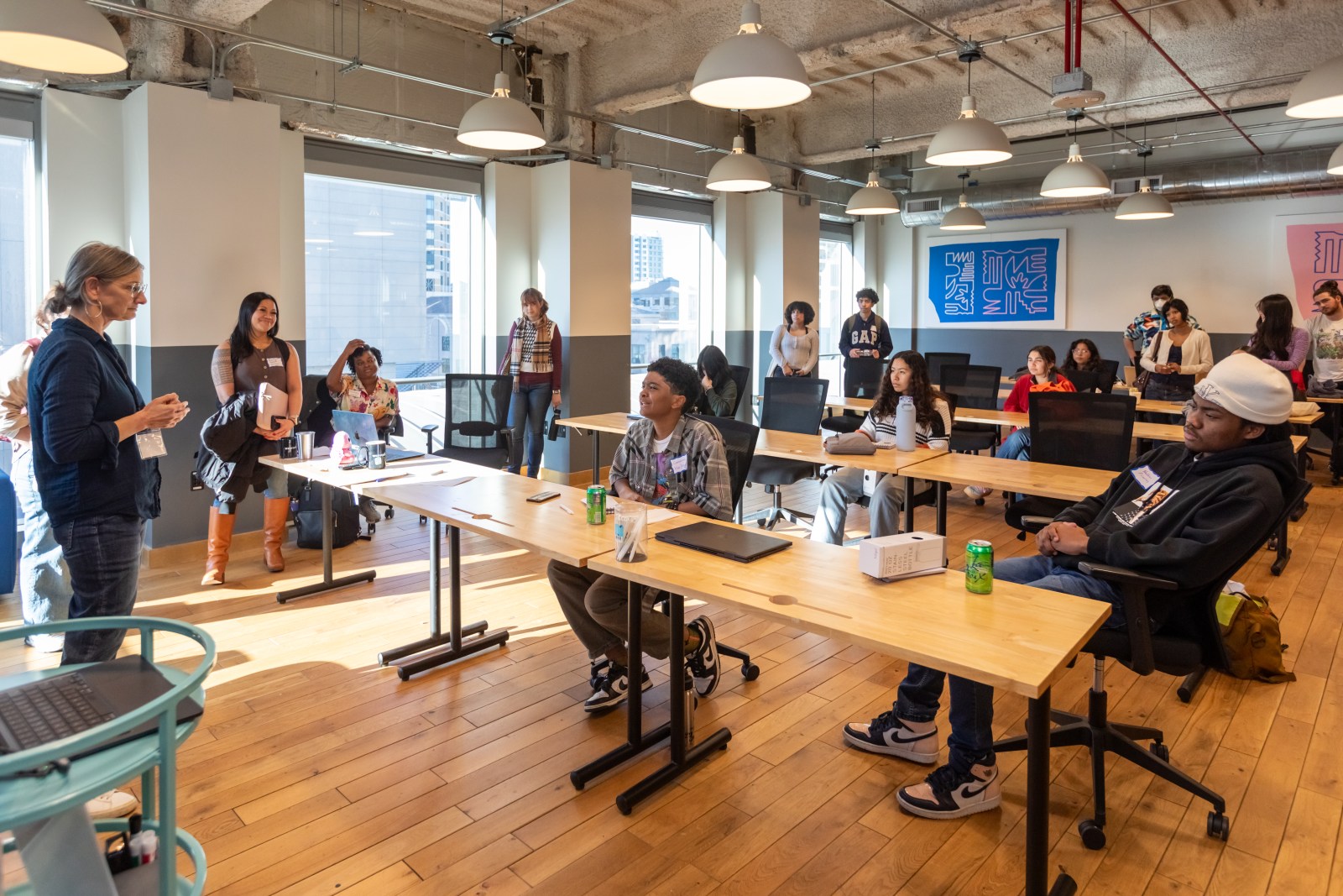 Oaklandside editor Esther Kaplan addresses student reporters during a fellowship training in January at the newsroom’s downtown headquarters. Credit: Kelly Sullivan for The Oaklandside