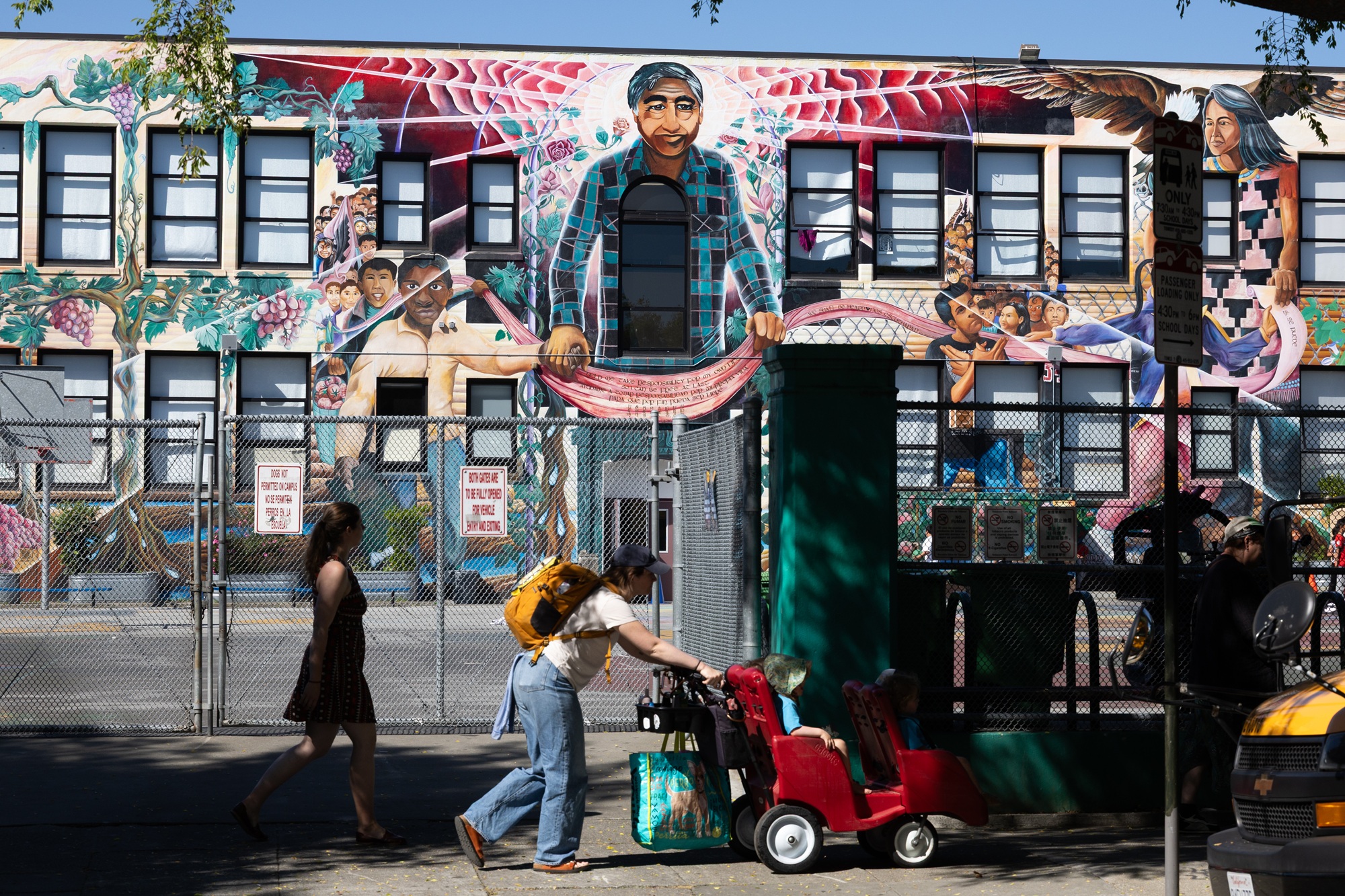 Pedestrians walk past César Chávez Elementary School on March 18, 2026, in San Francisco, California. Labor activist César Chávez has been accused in an investigation of sexual abuse of women and minors. (Benjamin Fanjoy/Getty Images)