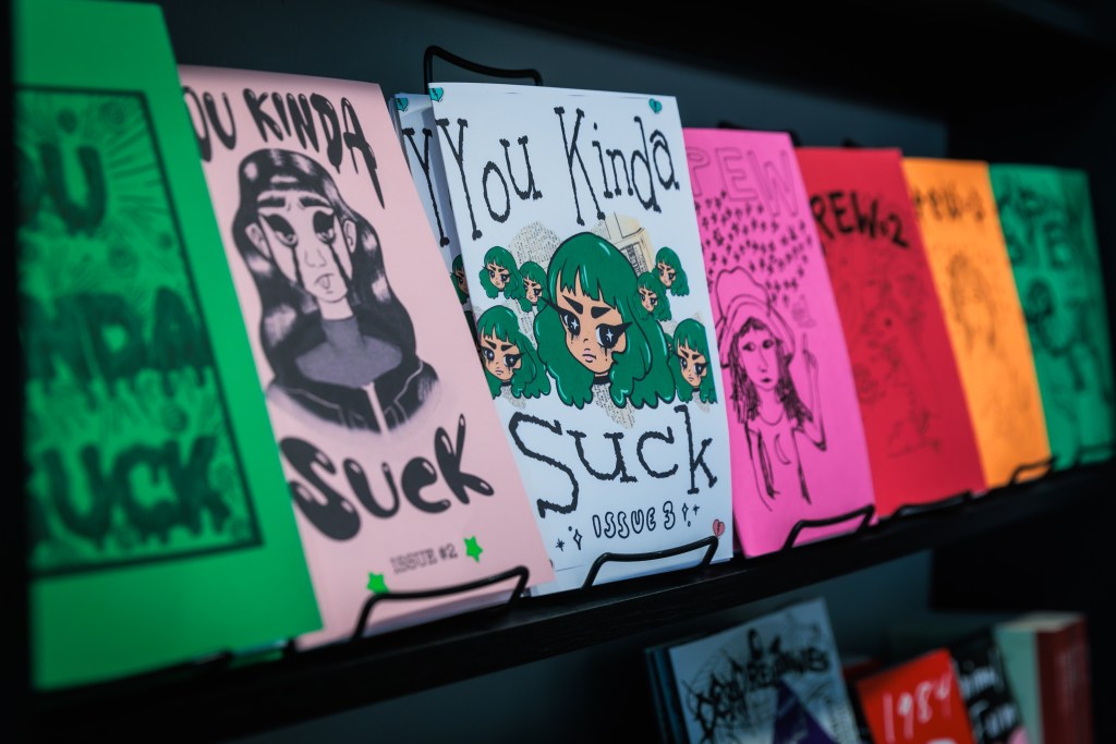A collection of colorful Zines from the “You Kinda Suck” and “Spew” series are displayed in a shelf against a wall inside Page Against the Machine on Aug. 9, 2023. (Richard H. Grant | Signal Tribune)