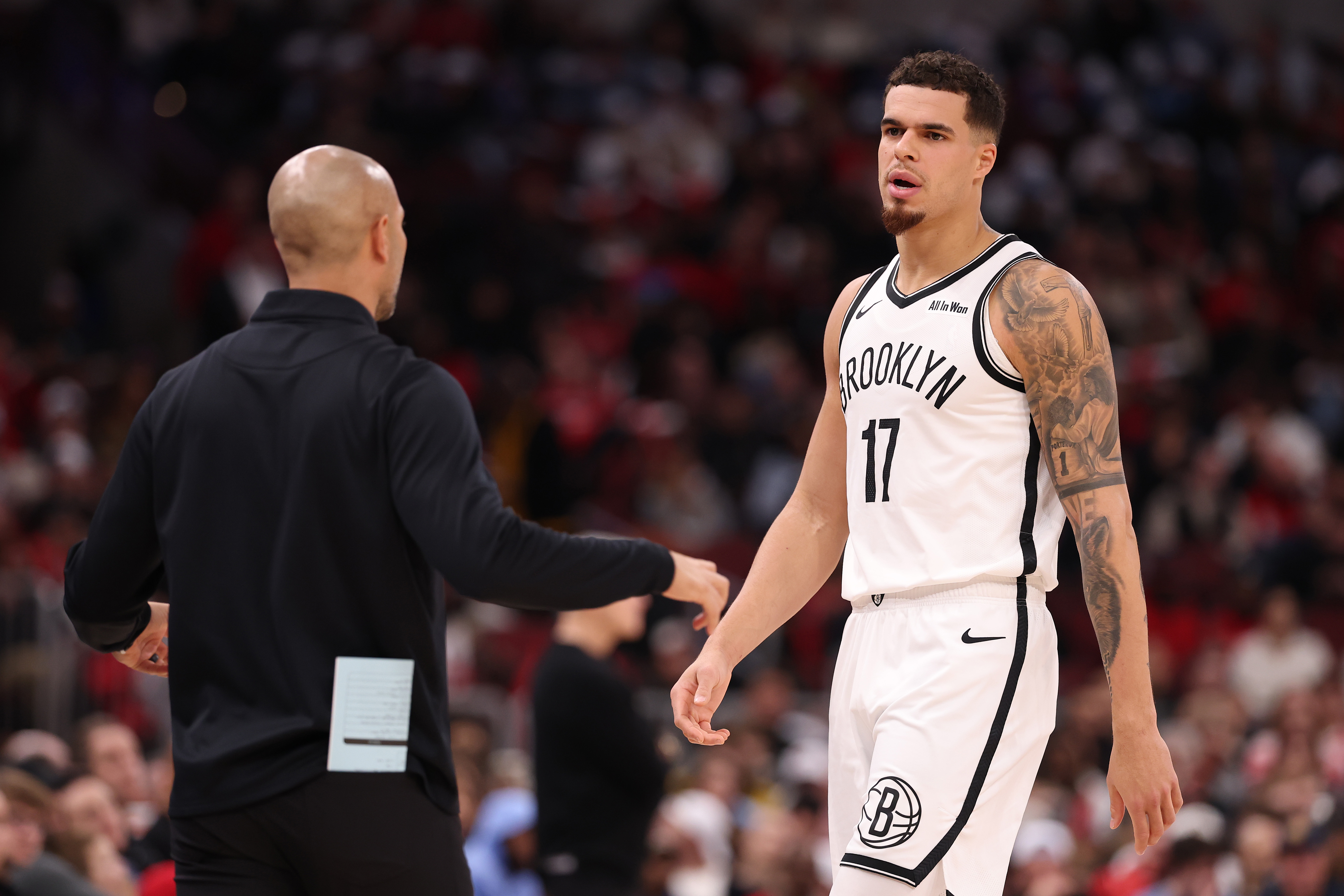 GettyCHICAGO, ILLINOIS – DECEMBER 03: Michael Porter Jr. #17 of the Brooklyn Nets talks with head coach Jordi Fernandez against the Chicago Bulls during the first half at the United Center on December 03, 2025 in Chicago, Illinois. (Photo by Michael Reaves/Getty Images)