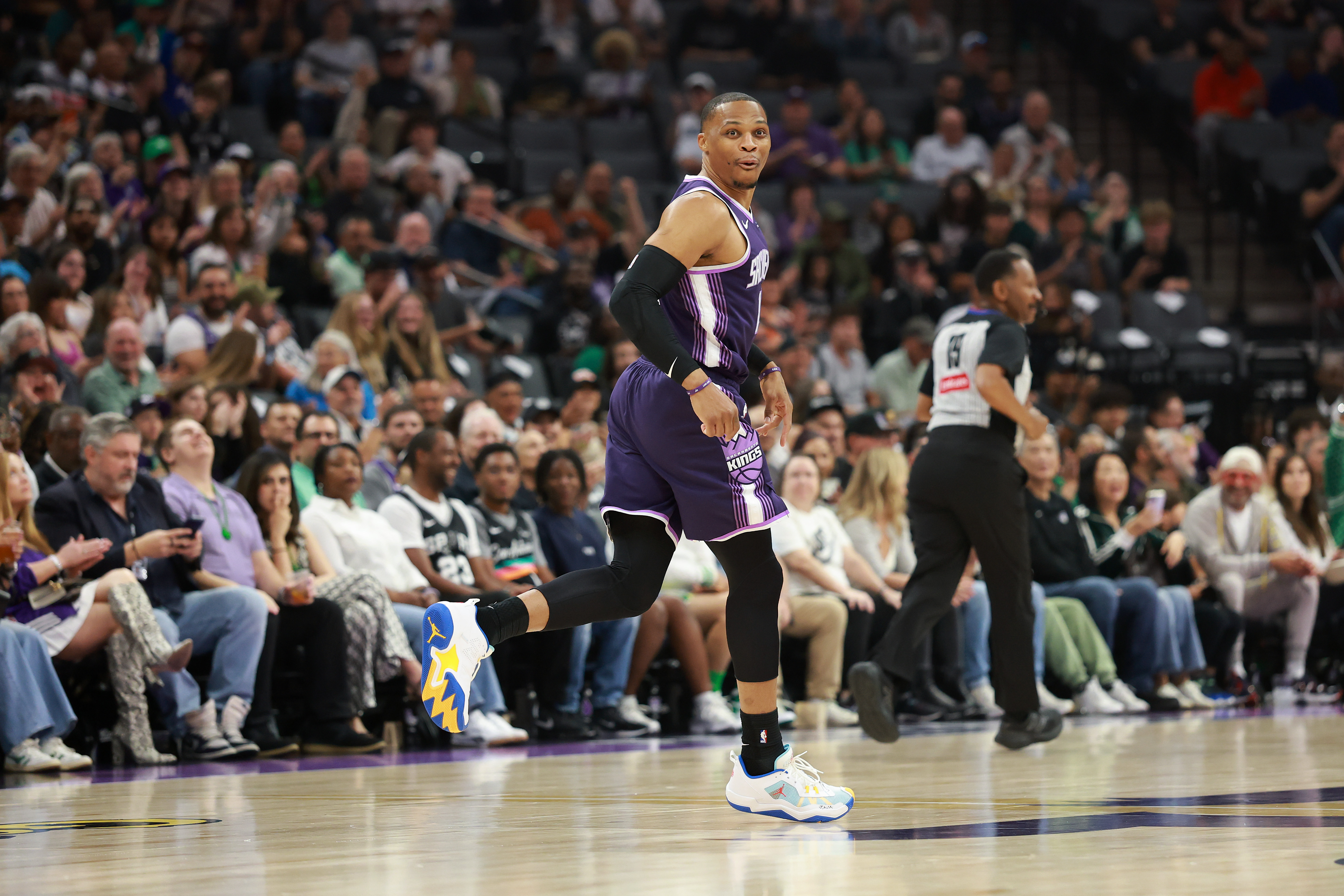 GettySACRAMENTO, CALIFORNIA – MARCH 17: Russell Westbrook #18 of the Sacramento Kings reacts after making a basket against the San Antonio Spurs during the first half at Golden 1 Center on March 17, 2026 in Sacramento, California. (Photo by Ezra Shaw/Getty Images)