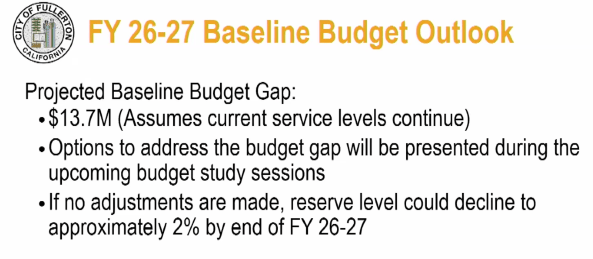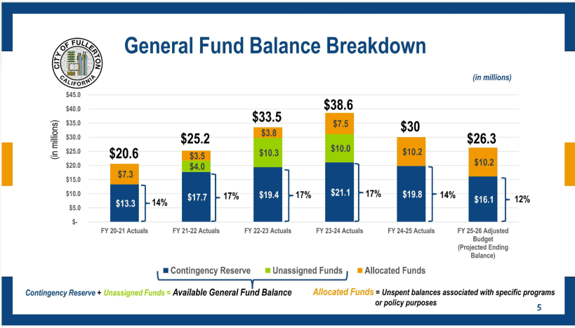 The 2025-26 fiscal year review presented at the March 17, 2026 council meeting revealed that Fullerton’s unassigned fund balance was fully depleted. Interim Finance Director Stephen Avalos reported that the city’s contingency reserve had dipped to 14%, below the targeted 17%. Projections further indicate an operating deficit of $3.7 million for the end of FY 2025-26. In addition, an accounting error was disclosed. City staff revealed that during an audit, funds previously considered part of the general fund reserves had already been spent or earmarked for specific projects. This revelation significantly shrank Fullerton’s financial cushion, raising concerns that reserves could drop to a precarious 2% without swift corrective measures.
