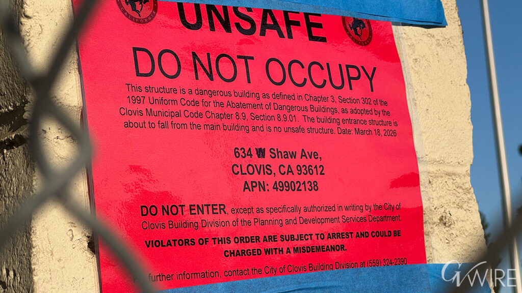 “The city’s Building Division inspected the property and posted a notice that it is not safe to occupy. The covered front entry area appears to be pulling away from the building. A temporary safety fence has been installed around the property. The city is working with the property owner to make the needed corrections. The building is closed until the issues are resolved,” Chad McCollum with the city of Clovis said.