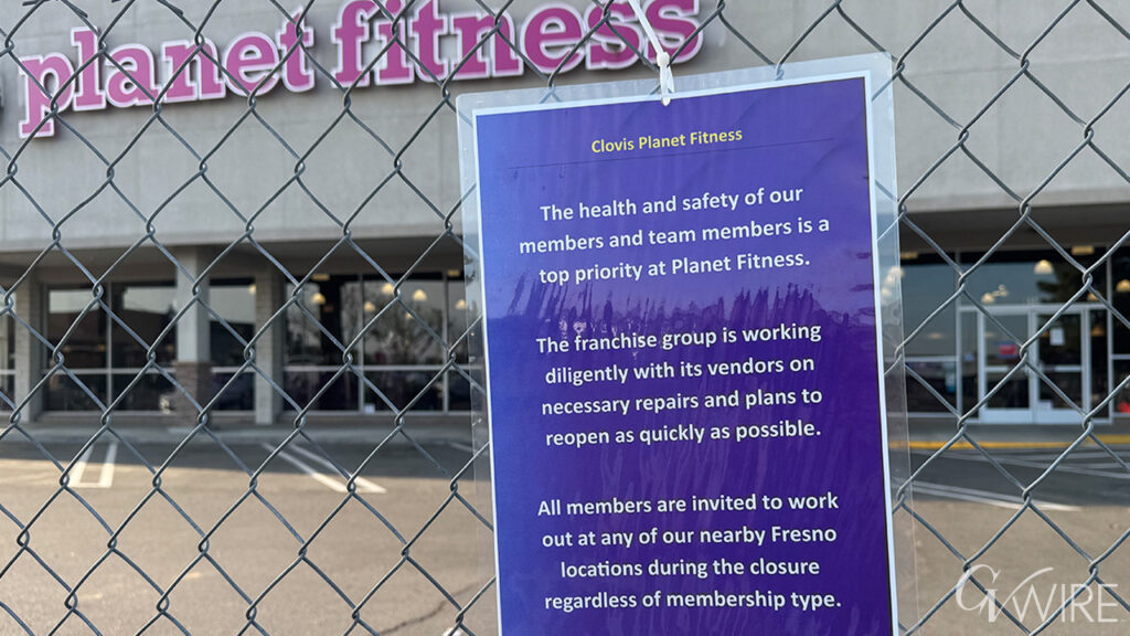 A notice in front of the Clovis Planet Fitness, seen March 23, 2026. (GV Wire/David Taub)
