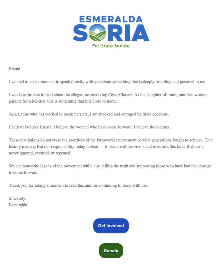 “We can honor the legacy of the movement while also telling the truth and supporting those who have had the courage to come forward,” Soria wrote in a solicitation for campaign donations.