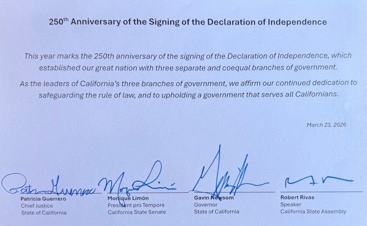 Chief Justice Patricia Guerrero, Governor Gavin Newsom, Senate President pro Tempore Monique Limón, and Speaker of the Assembly Robert Rivas issued a joint statement on Monday to mark the 250th anniversary of the Declaration of Independence.