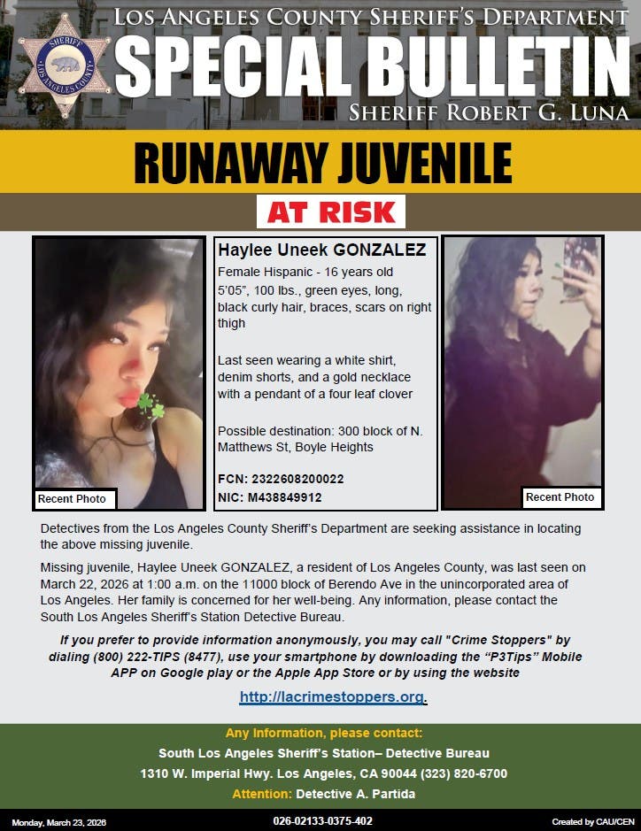 Anyone with information about Gonzalez’s whereabouts is asked to contact Detective Partida or the Sheriff’s South LA Station on-duty watch commander at 323-820-6700.