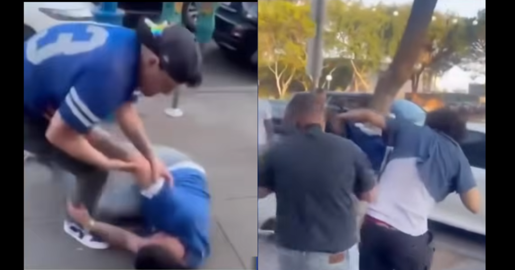 Witnesses observed the physical altercation moving past Fiesta Cantina toward Micky’s West Hollywood. Video of the incident shows at least four men involved in the melee, including individuals wearing blue jerseys marked with the number 93. One man in a jersey was seen being put in a headlock by one person while another struck him repeatedly in the face.