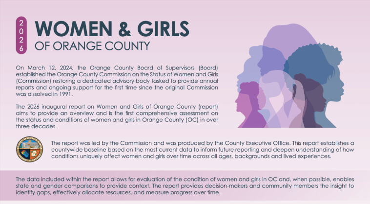 The inaugural report, the first of its kind in over thirty years, offers a comprehensive overview of the status of women and girls in Orange County (OC). While the findings indicate that women and girls in OC perform relatively well in terms of employment, earnings, and educational attainment compared to state benchmarks, challenges persist, particularly within the county’s high cost-of-living environment. With median rents surpassing California’s average by 20% and the national average by 69%, financial pressures can exacerbate existing disparities.