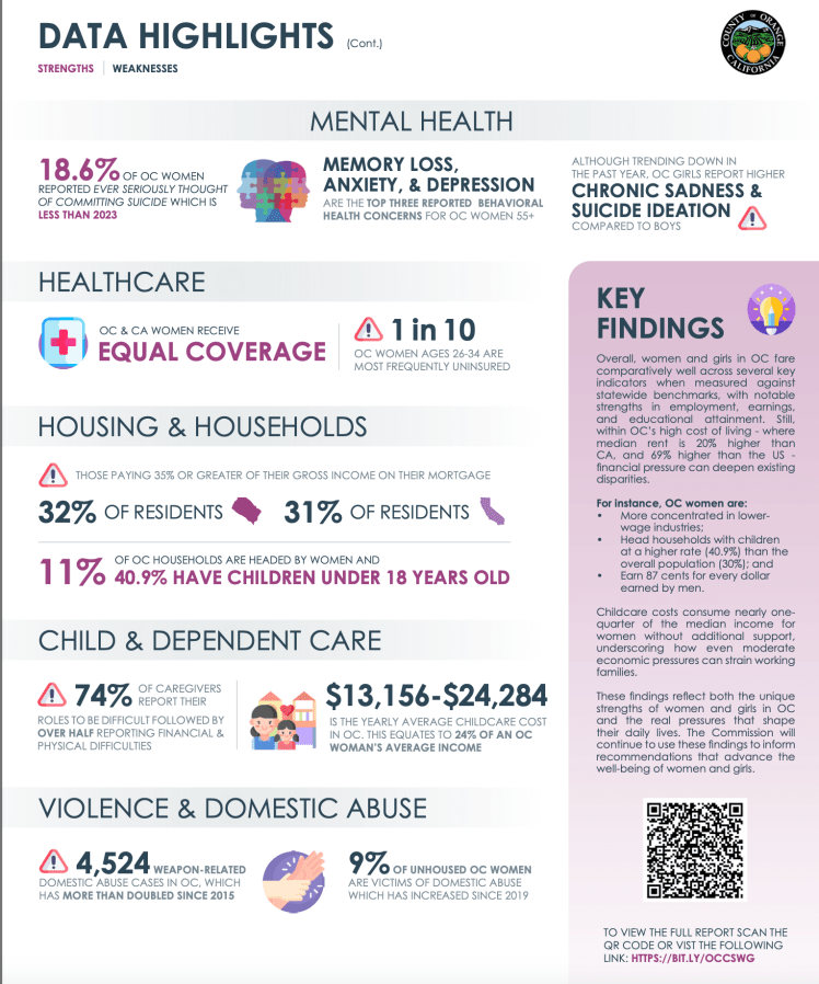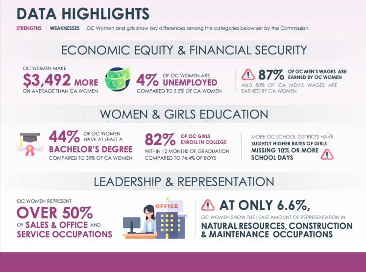 Key findings from the report reveal that OC women are disproportionately represented in lower-wage industries, head households with children at a significantly higher rate (40.9%) than the general population (30%), and earn just 87 cents for every dollar earned by their male counterparts. Additionally, childcare costs, which can account for nearly a quarter of median income for women without external support, highlight the substantial economic pressures facing working families.