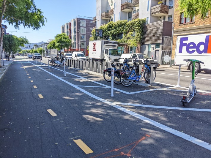 Some of the widened, median-protected bike lanes. Photo: Streetsblog/Rudick