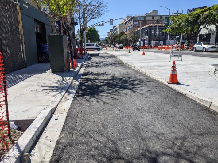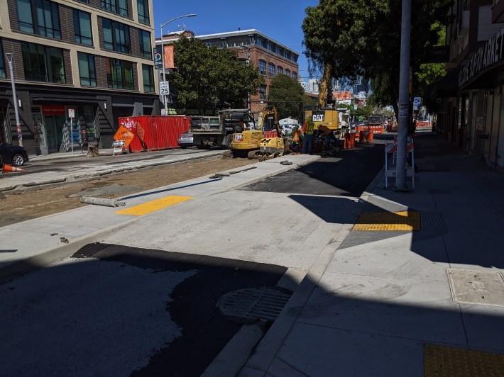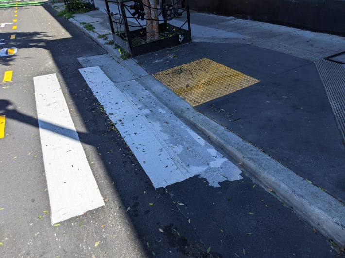 A bike station protected bike lane. Photo: Streetsblog/RudickA raised crosswalk and loading zone are going in. Photo: Streetsblog/RudickADA ramp for one of the midblock crossings. Photo: Streetsblog/Rudick