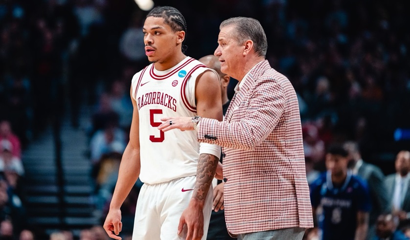 John Calipari, with freshman sensation Darius Acuff Jr. in this photo, will coach against Arizona in the NCAA tournament for the first time (Arkansas photo)