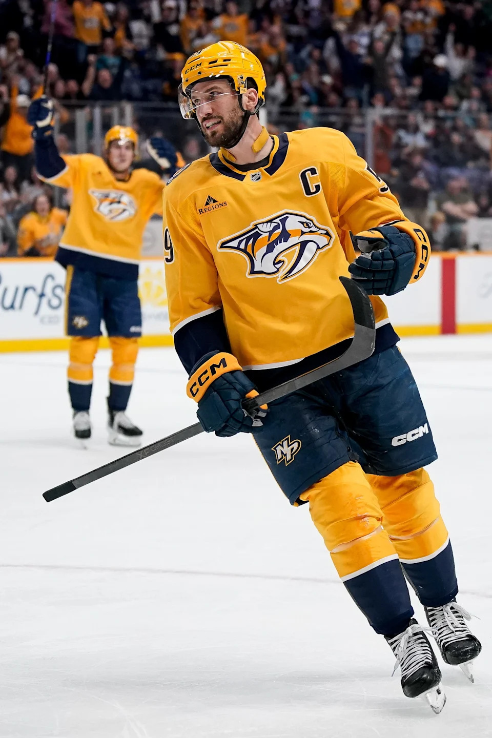 Nashville Predators defenseman Roman Josi (59) celebrates his goal against the San Jose Sharks during the first period at Bridgestone Arena in Nashville, Tenn., Tuesday, March 24, 2026.
