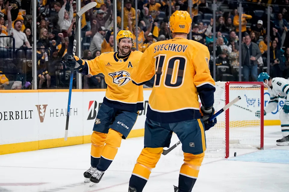 Nashville Predators left wing Filip Forsberg (9) celebrates his goal against the San Jose Sharks with center Fedor Svechkov (40) during the first period at Bridgestone Arena in Nashville, Tenn., Tuesday, March 24, 2026.