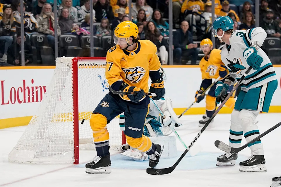 Nashville Predators right wing Luke Evangelista (77) scores a goal past San Jose Sharks goaltender Alex Nedeljkovic (33) during the first period at Bridgestone Arena in Nashville, Tenn., Tuesday, March 24, 2026.
