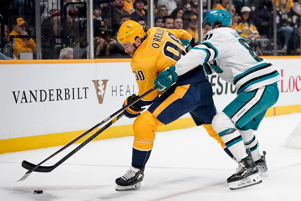 Nashville Predators center Ryan O’Reilly (90) battlesSan Jose Sharks right wing Adam Gaudette (81) during the first period at Bridgestone Arena in Nashville, Tenn., Tuesday, March 24, 2026.