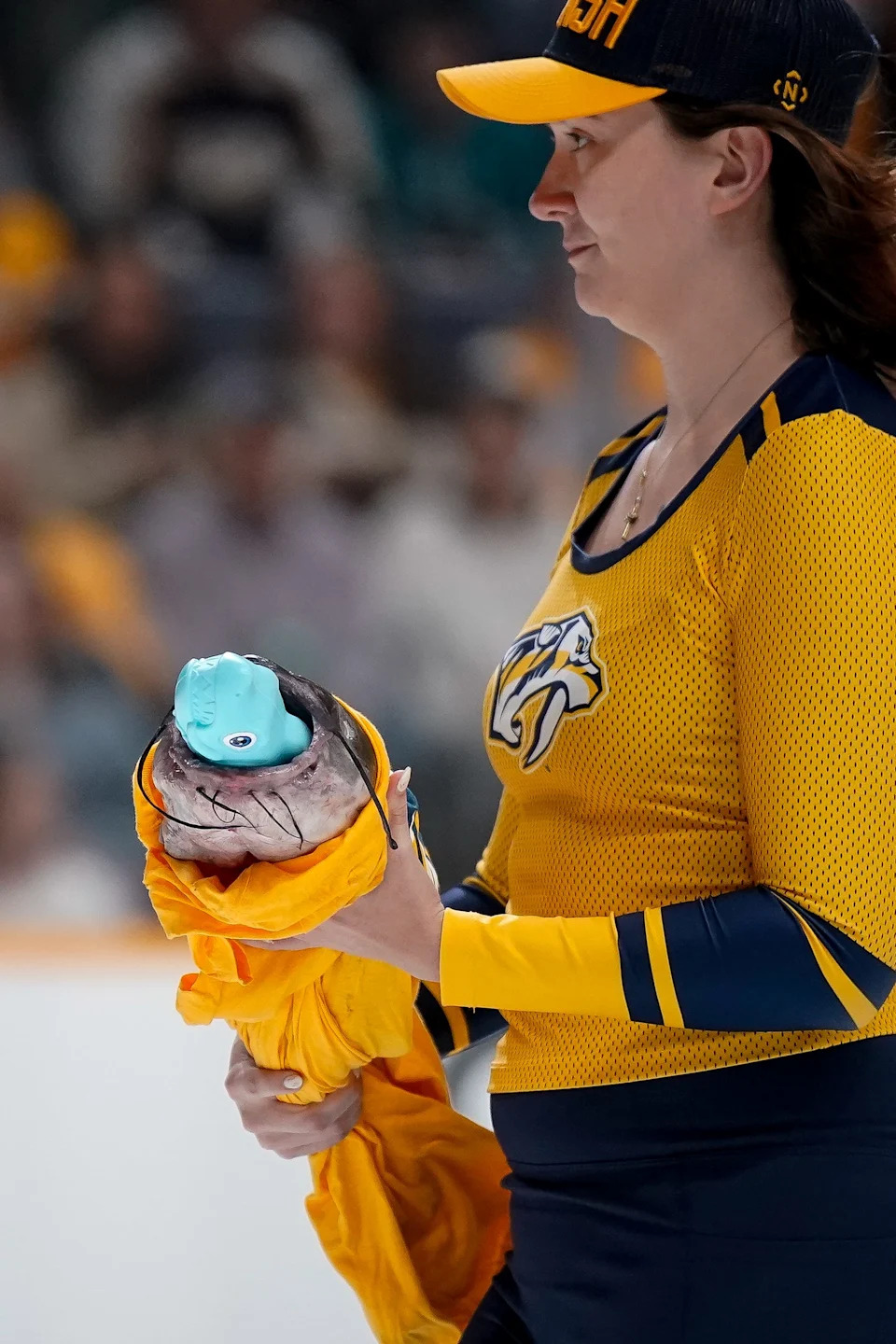 A catfish is removed from the ice before a game between the Nashville Predators and the San Jose Sharks at Bridgestone Arena in Nashville, Tenn., Tuesday, March 24, 2026.