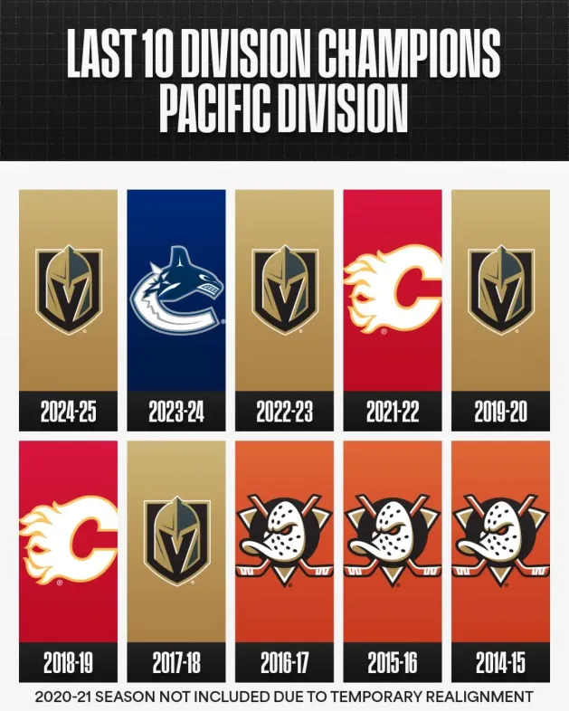 In 2023-24, the Vancouver Canucks shocked the West by clinching the Pacific Division by five points. Vegas owned the division for the first three months of the season, but Vancouver separated themselves in mid-January. With 10 regular season games left to play, the Canucks held a five-point edge. Their advantage held up and earned them the Pacific Division crown.