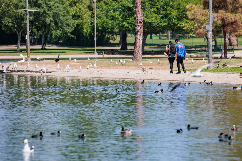 A couple walk with their dog another the edge of the water at the El Dorado Duck Pond on April 11, 2022. (Richard H. Grant | Signal Tribune)