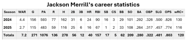 (In 2024, while turning in one of the finest rookie seasons this century, Merrill endured just a pair of mini-slumps and batted .292 with an .826 OPS while the Padres went 91-65 when he played.)