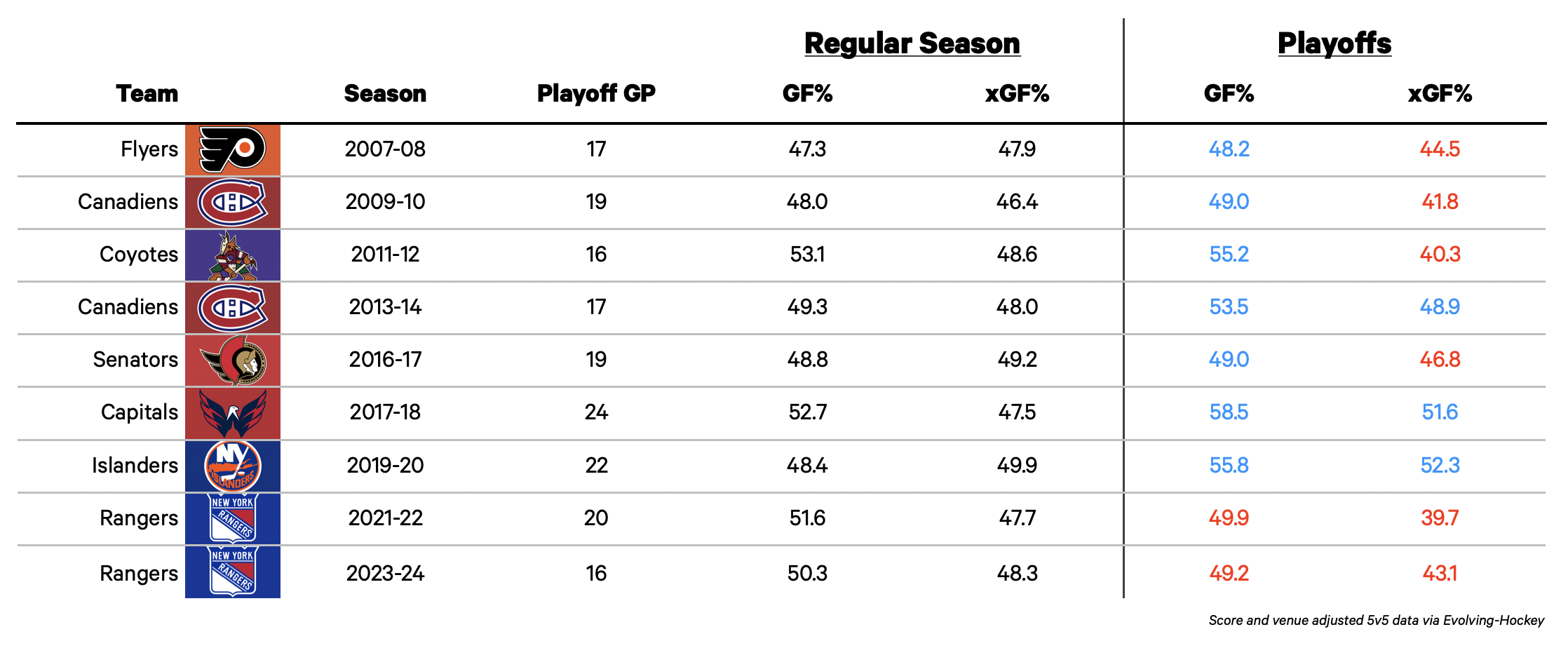 Since 2008, 296 teams have qualified for the playoffs (including the 2020 play-in round). Of those 296 teams, 70 reached the playoffs after falling below the break-even mark in five-on-five expected goals according to Evolving-Hockey’s model. Only nine went on to do real playoff damage, with at least a conference final appearance: the 2018 championship Capitals, 2024 New York Rangers, 2022 Rangers, 2020 New York Islanders, 2017 Ottawa Senators, 2014 Canadiens, 2012 Arizona Coyotes, 2010 Canadiens and 2008 Philadelphia Flyers.