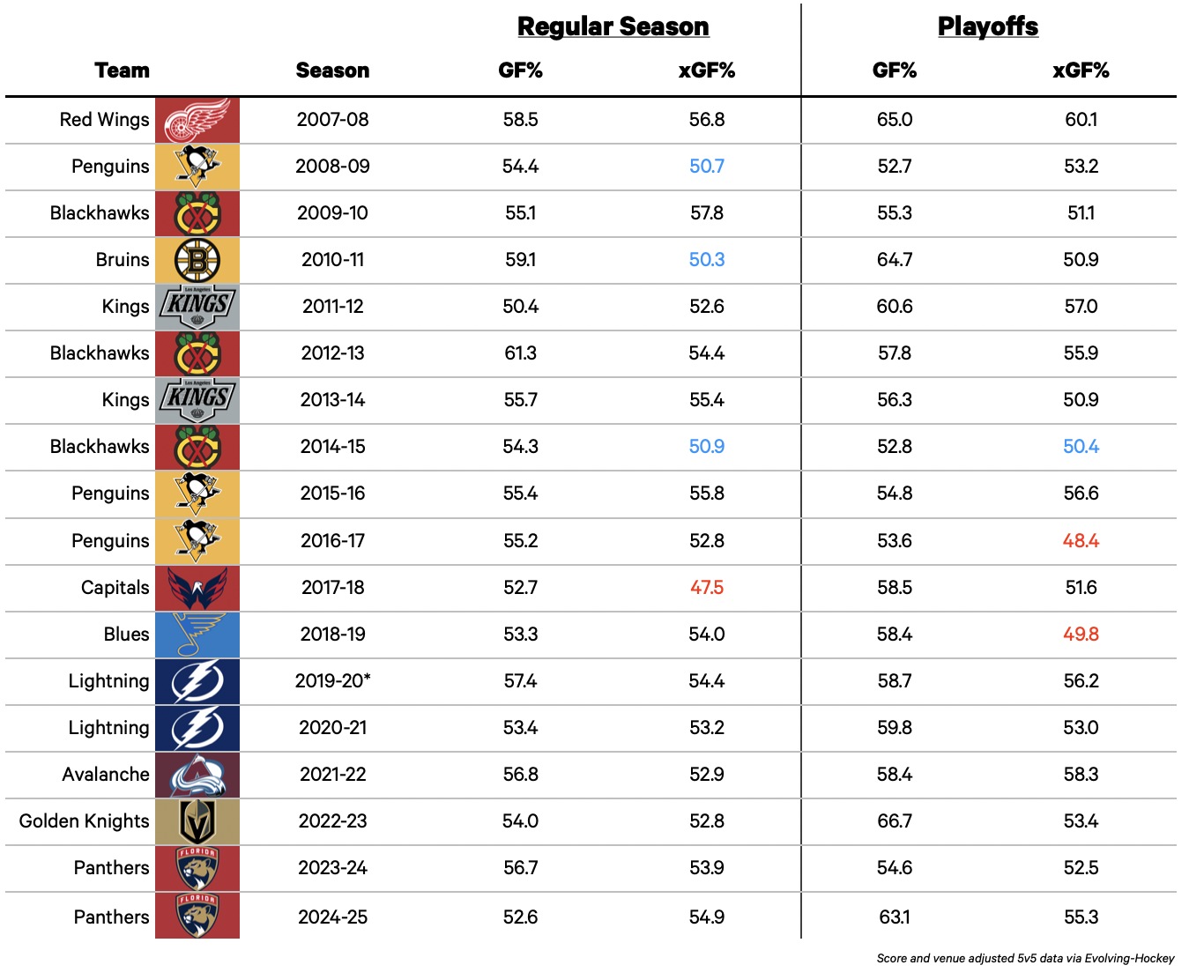 Aside from Washington, 16 of the last 17 champions all stayed about that 50 percent mark in expected goals in their respective regular seasons. Some teams like the 2009 Pittsburgh Penguins, 2011 Bruins, and 2015 Chicago Blackhawks only hovered above that mark; others, including the 2008 Detroit Red Wings and 2025 Panthers, shined in the regular season. And 15 of the last 17 champs carried those five-on-five strengths into the playoffs on their way to the Stanley Cup.
