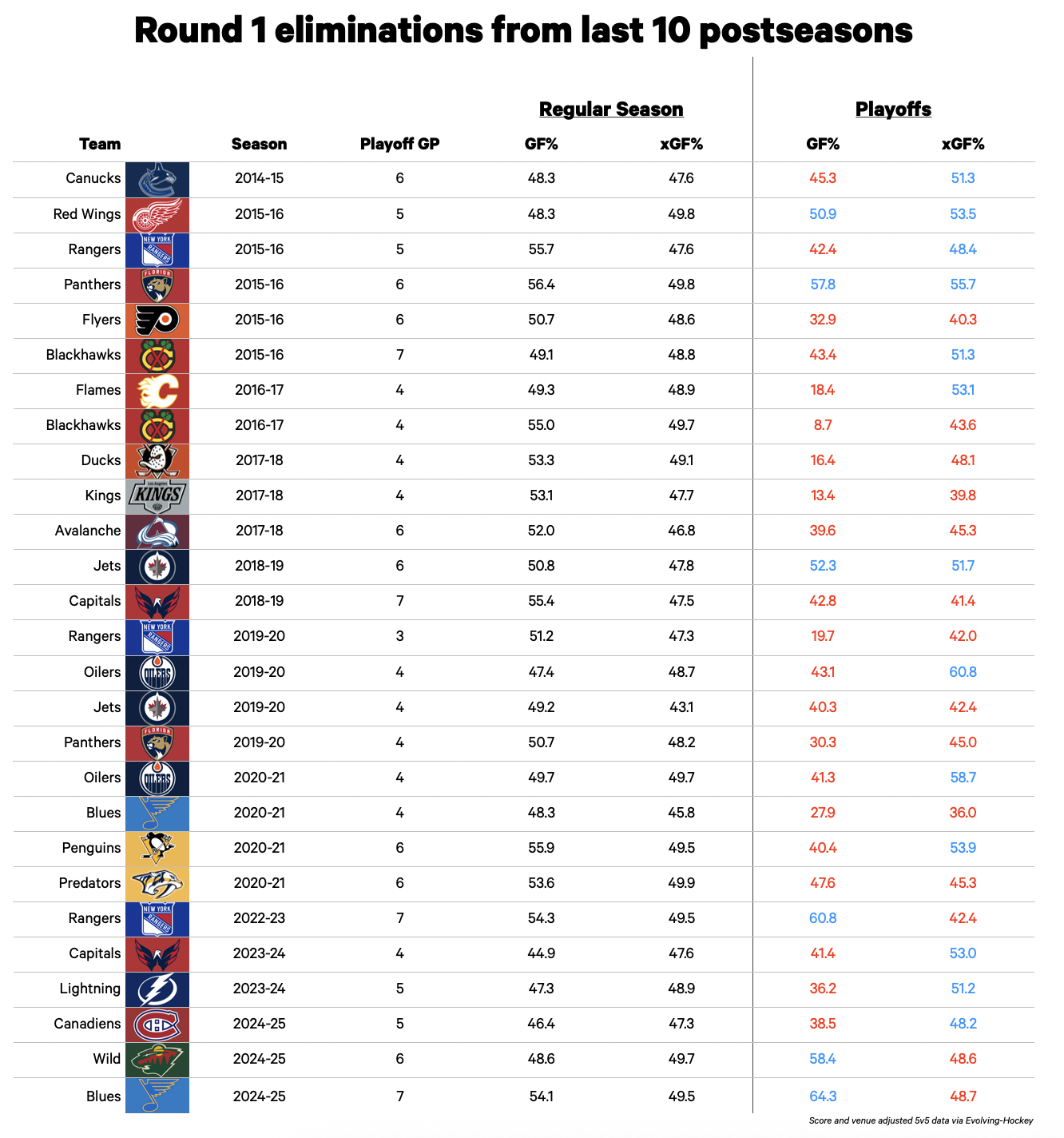 Usually, goal differential is used as a temperature check of sorts for playoff teams. In the last 17 years, of the 25 teams that reached the postseason in the negatives, 20 were eliminated in Round 1.