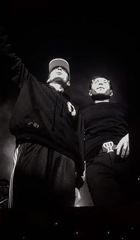 Peso Pluma (Left) and Tito Double P (Right) looking into the crowd on Tuesday, March 11, 2026, at the Savemart Center in Fresno. (Natalie Mejia )