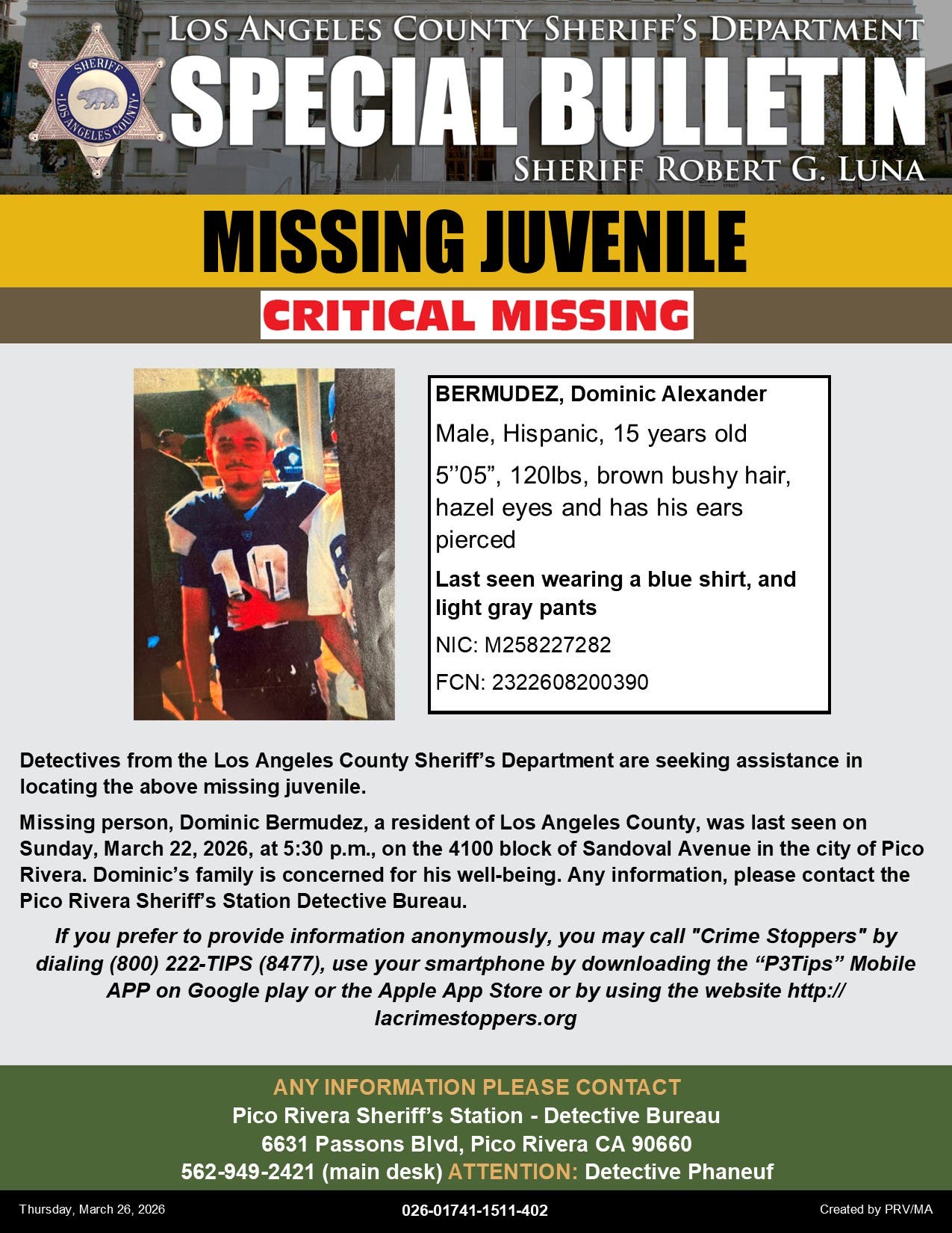 Dominic Alexander Bermudez was last seen at around 5:30 p.m. near the 4100 block of Sandoval Avenue, in a neighborhood northwest of the intersection of Beverly Boulevard and San Gabriel River Parkway, according to the Los Angeles County Sheriff’s Department.