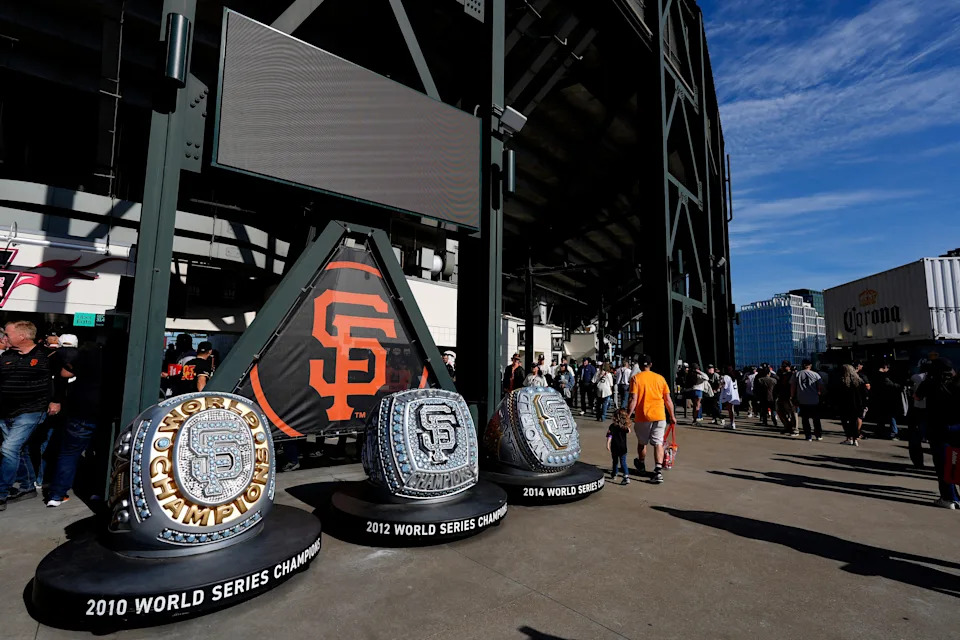 Large San Francisco Giants championship rings are seen before the game between the San Francisco Giants and the New York Yankees on Opening Day at Oracle Park on March 25, 2026 in San Francisco, Calif.