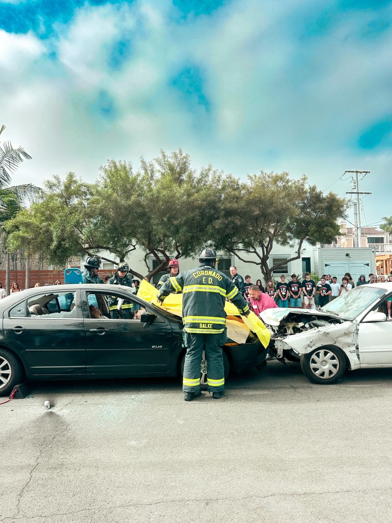 On Tuesday, March 24, the Coronado Police Department shut down Seventh Street at E and F Avenue to stage a realistic drunk driving crash simulation. 11th and 12th graders at Coronado High School lined the streets to watch the accident unfold.