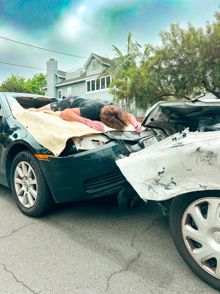 Zimmer Geraldi lays face down on the hood of the car, pretending to be dead.