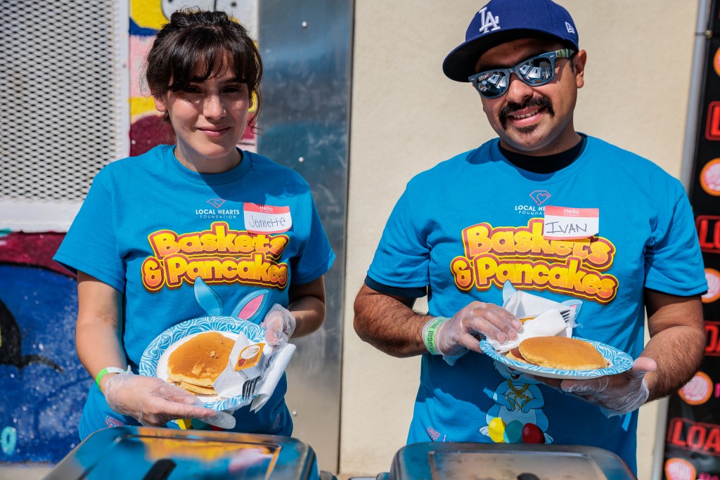 Two Local Hearts Foundation volunteers hold plates of pancakes at the Baskets and Pancakes event at MacArthur Park on April 16, 2022. (Richard h. Grant | Signal Tribune)